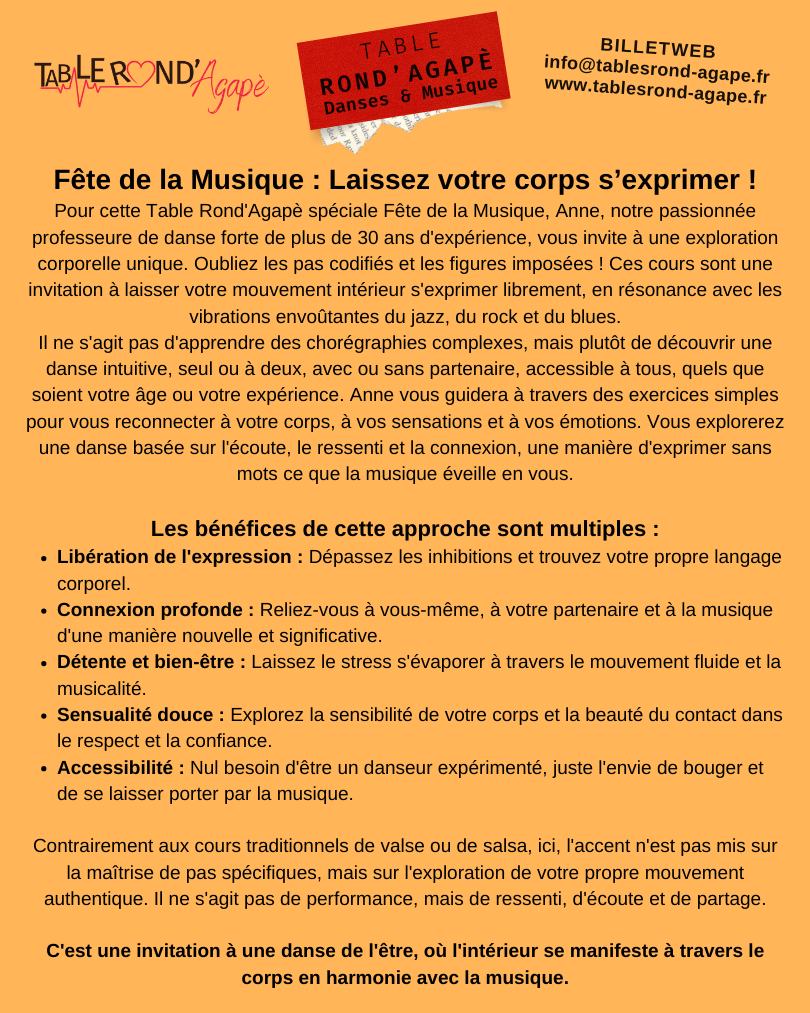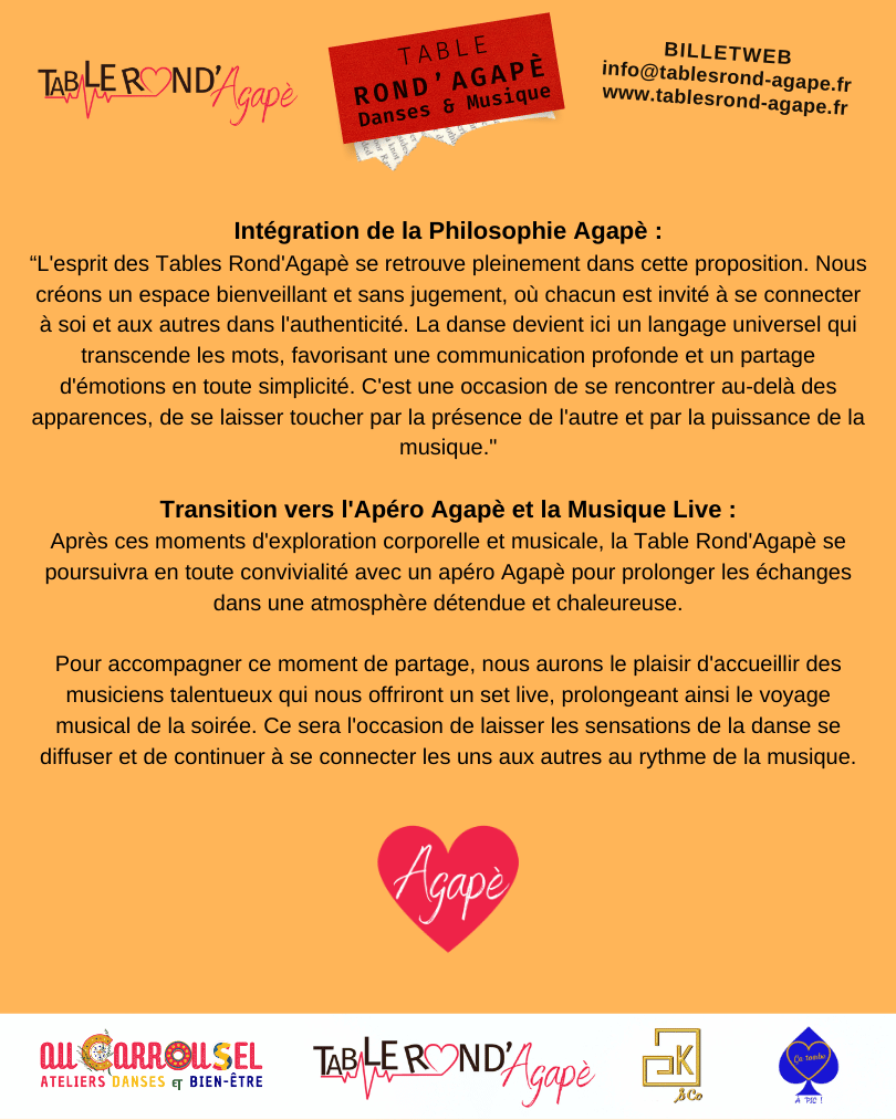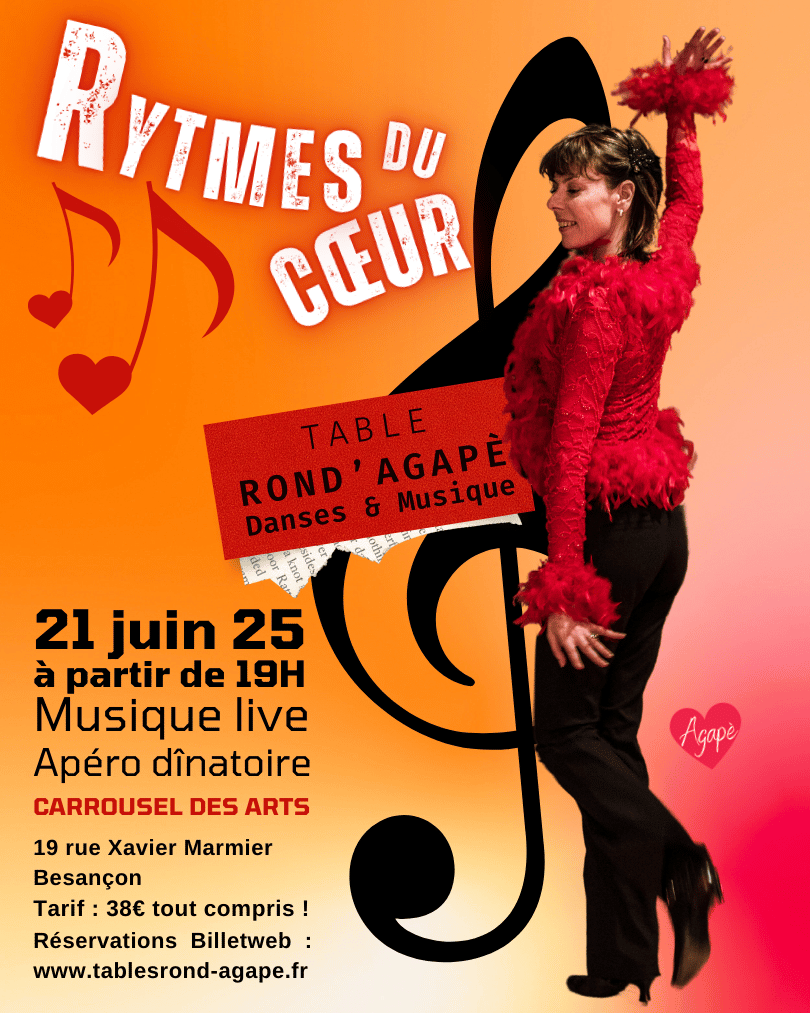 Préparez-vous à une soirée exceptionnelle et libératrice pour la Fête de la Musique ! Le 21 juin, les Tables Rond'Agapè vous invitent à une expérience unique de "Danses & Musique au Cœur du Rythme" au Carrousel des Arts à Besançon.